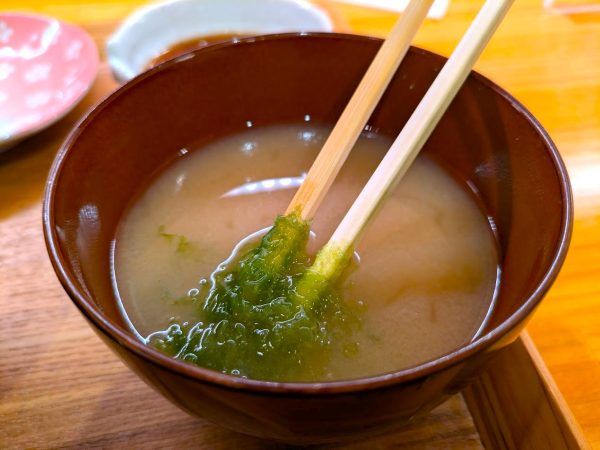 お味噌汁は、磯の香りがする国産あおさを使用した体にやさしいお味噌汁。キレイなあおさですね。手間暇かけた健康的なだし天丼ランチ、とってもおいしいです。夜の創作天ぷらも珍しくこだわりの逸品だそうです。いいですね~。