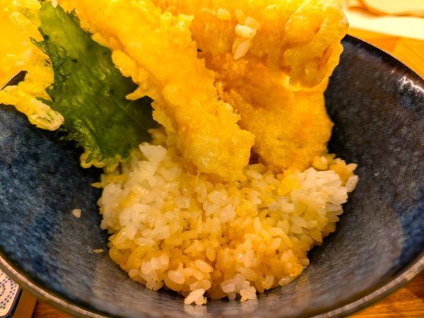 ご飯のお米は、コシヒカリ100%!粒がしっかりとしたお米です。天つゆは天ぷらにはかかっておらず、ご飯にのみ軽くかかっています。これもこだわりっ。