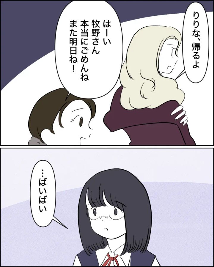 風見さんのお母さんは私たちに挨拶することもなく「りりな、帰るよ」と言うとさっさと歩きだしました。風見さんは「はーい。牧野さん、本当にごめんね。また明日ね!」と軽い感じで言い、歩実は少し戸惑った様子で「・・ばいばい」と返しました。