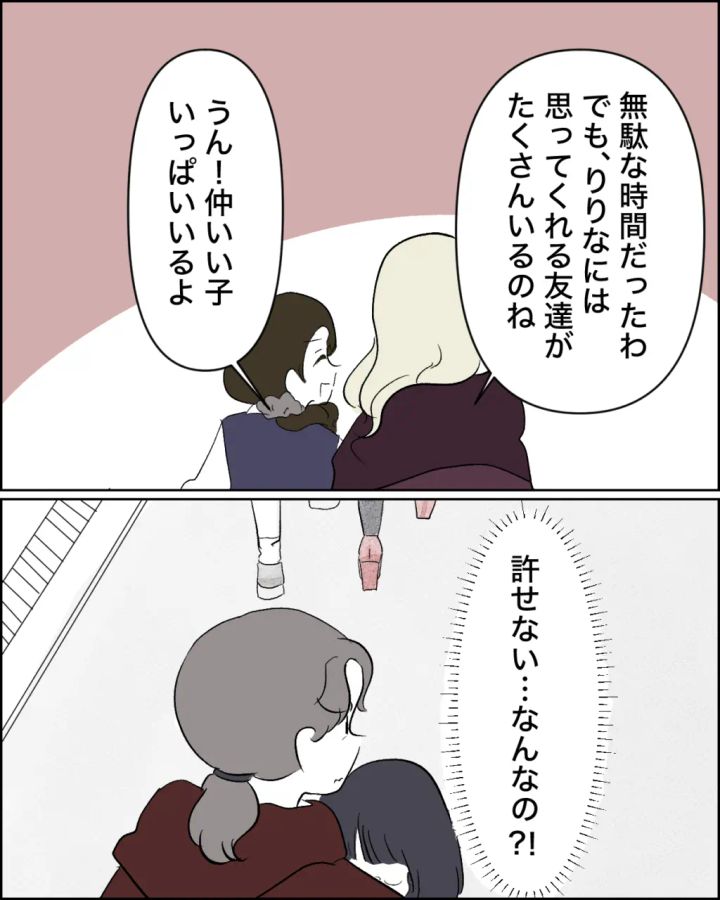 「無駄な時間だったわ。でも、りりなには思ってくれる友達がたくさんいるのね」「うん!仲いい子いっぱいいるよ」と笑顔で帰って行く風見さん親子の背中を眺めながら「許せない・・なんなの?」と怒りがこみ上げました。