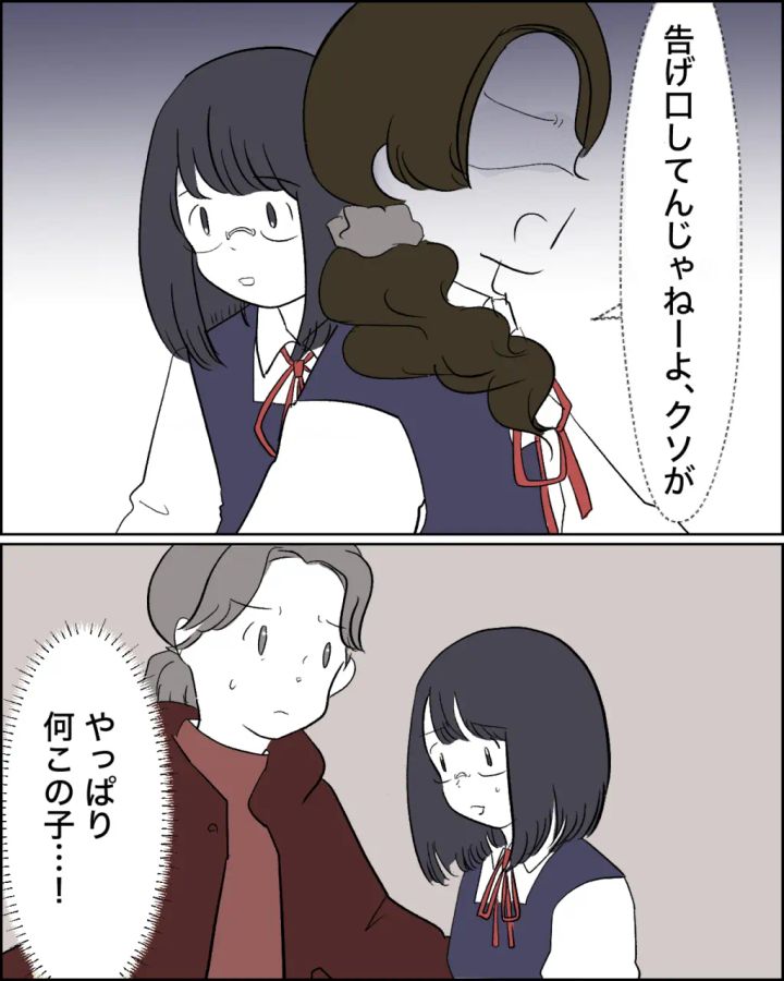すると、すれ違いざまに「告げ口してんじゃねーよ、クソが」と風見さんが歩実にボソッと言ったのが聞こえました。私は驚いて固まる歩実の背中をさすりながら、「やっぱり。何この子・・!」と驚き、風見さんはやはり反省などしていないと確信しました。