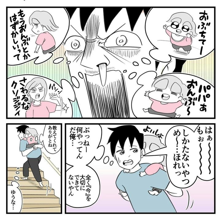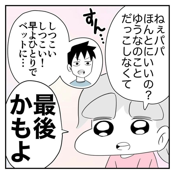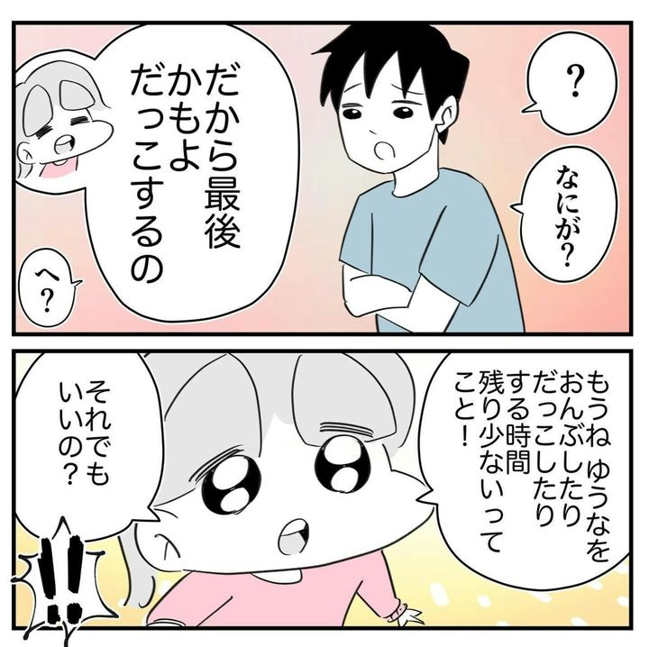 こばぱぱ(@kobapapaaa)さんの小学生の娘が「抱っこして」と言い出したので、困り果ててしまいました。そんな娘が「最後かもよ」と言い始め、ハッとします。これからどんどん成長していく娘に「抱っこして」と言われる瞬間はもうなくなるのだと気づき、「今」を大切にしようと思ったこばぱぱさん。しかし、わがままを聞いてもらえた娘の方は…。