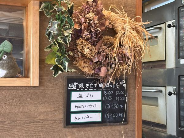 レジ奥の黒板には、その日のパンの焼きあがりの目安時間が書いてあります。