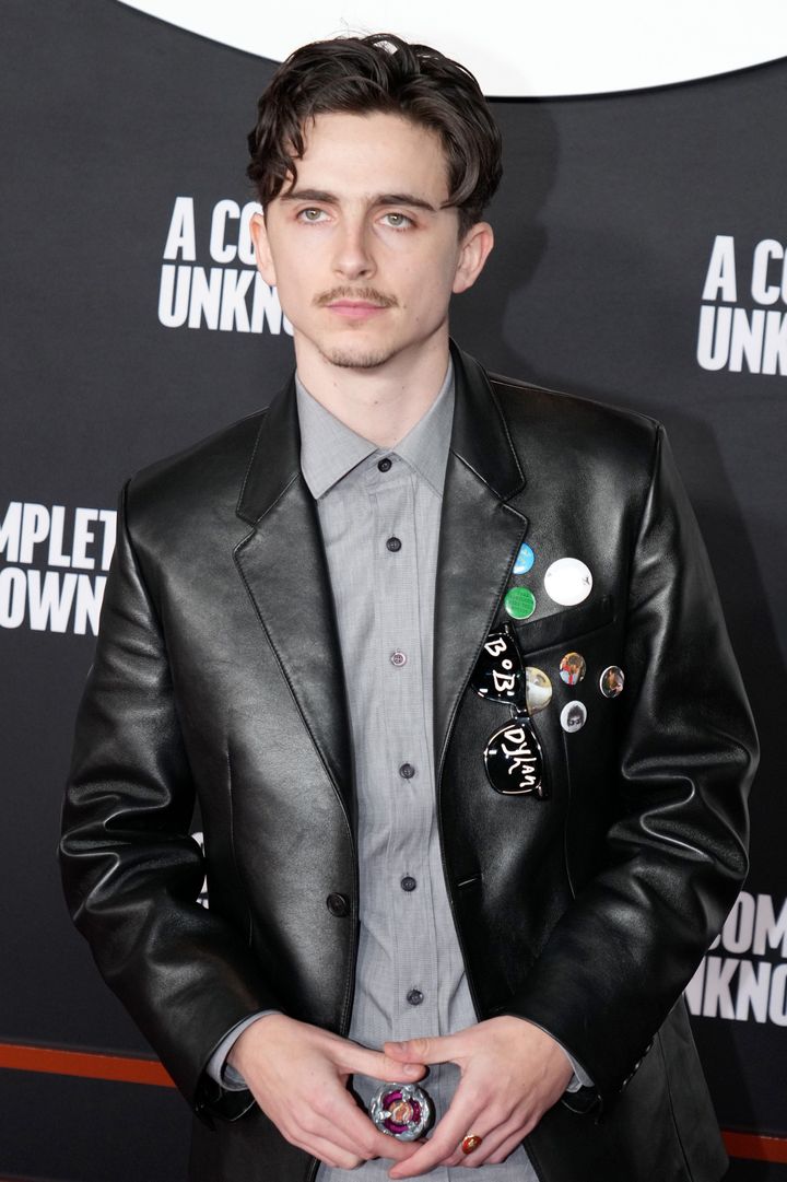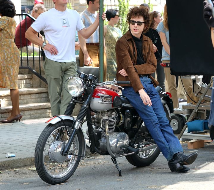 ジェームズ・マンゴールド監督によるボブ・ディランの伝記映画『名もなき者/A COMPLETE UNKNOWN』の撮影現場で、ボブになりきったティモシーをキャッチ。ギターや歌の練習に5年半をかけて臨んだそう。