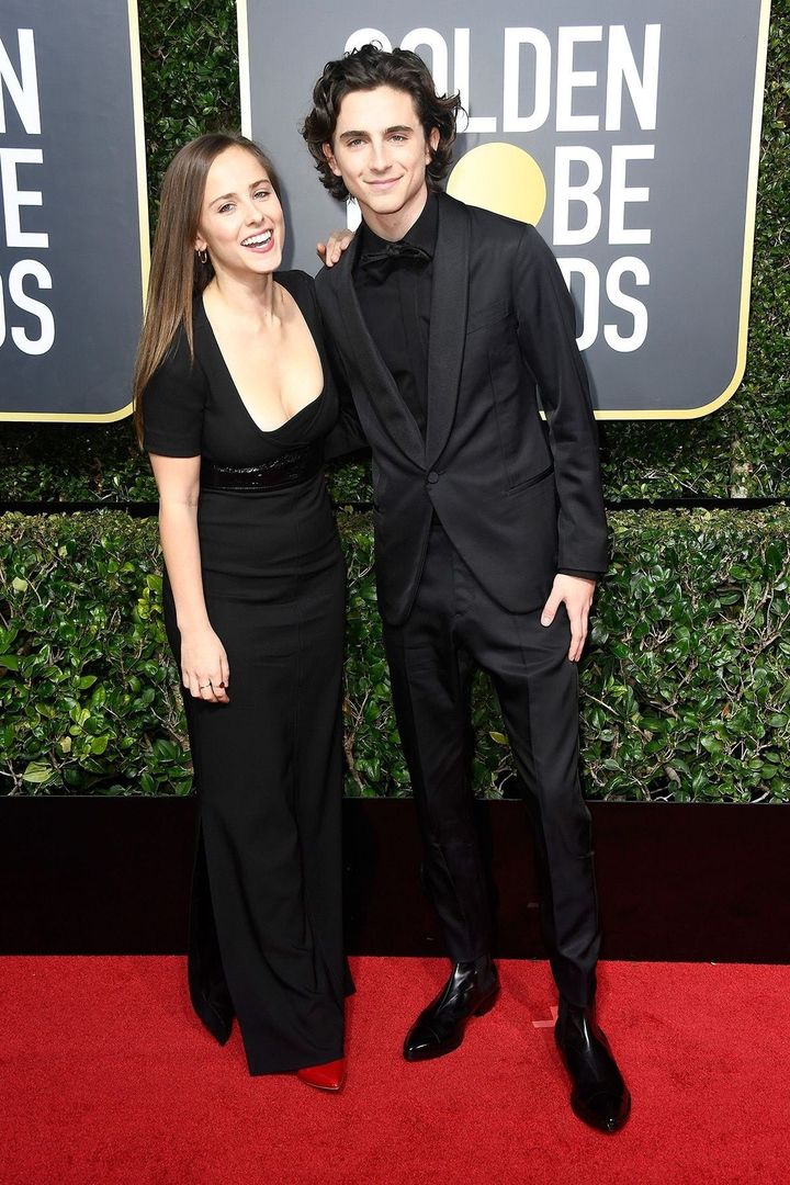 そっくりな俳優の姉ポーリーヌとともに、ゴールデン・グローブ賞の授賞式へ。オールブラックのタイトなスーツがシック。