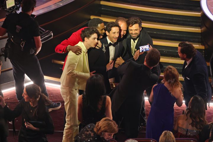 レアなパステルイエローの装いで臨んだアカデミー賞授賞式。主演男優賞にノミネートされていたライバルたち4名(左からコールマン・ドミンゴ、エイドリアン・ブロディ、レイフ・ファインズ、セバスチャン・スタン)と仲良く並んでパシャリ。