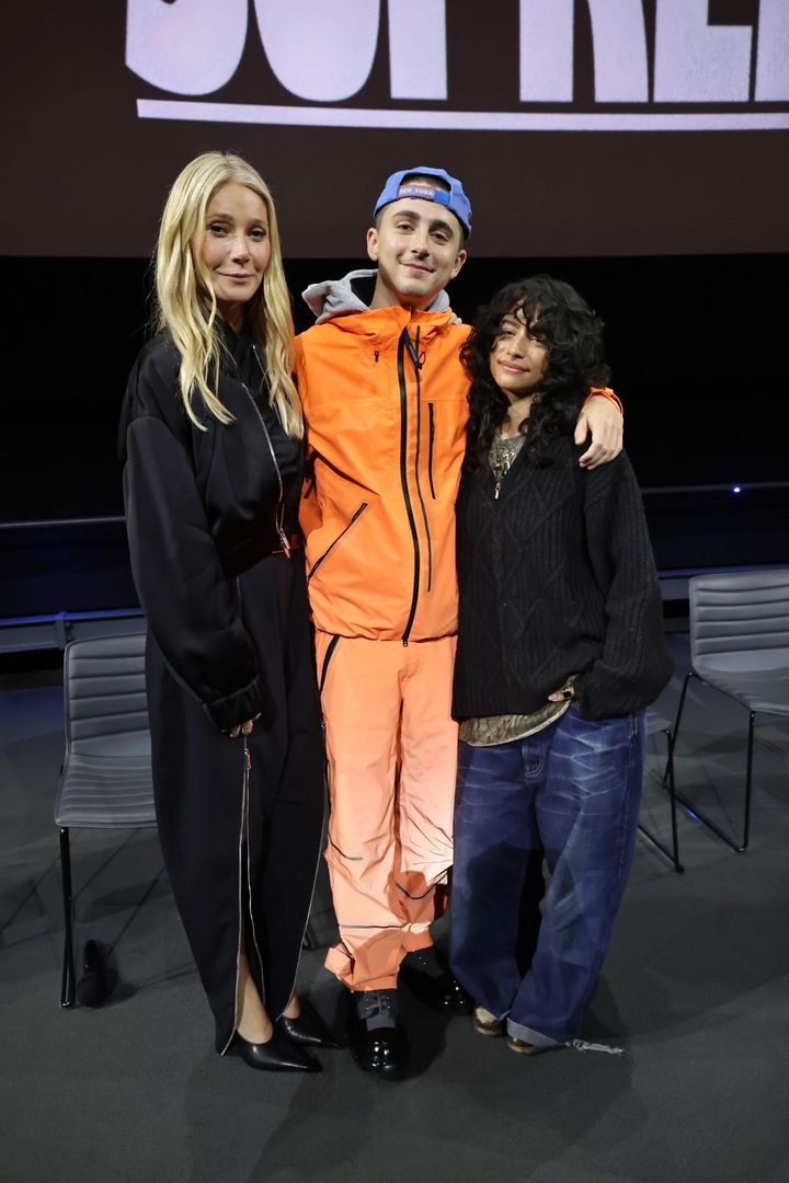 この日はLAで『マーティ・シュプリーム』のトークイベント付き上映会が行われ、共演したグウィネス・パルトロウ(左)、オデッサ・アザイオン(右)と登壇してポーズ。ビビッドなティモシーの装いはもちろん、ピンポン玉をイメージしたもの。