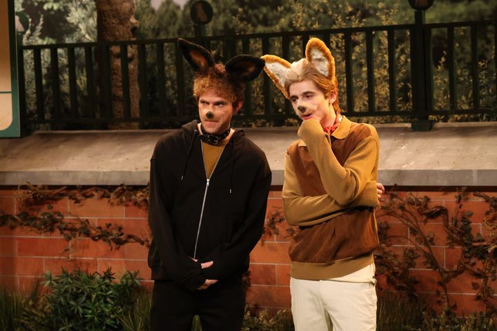 3度目のホストとしてコメディ番組『SNL』に出演し、さまざまなコントに挑戦。こちらはそのうちのひとつ、「もし犬が人間のように話し、振る舞ったら」という設定のコント。隣にいるのはコメディアンで俳優のマイキー・デイ。