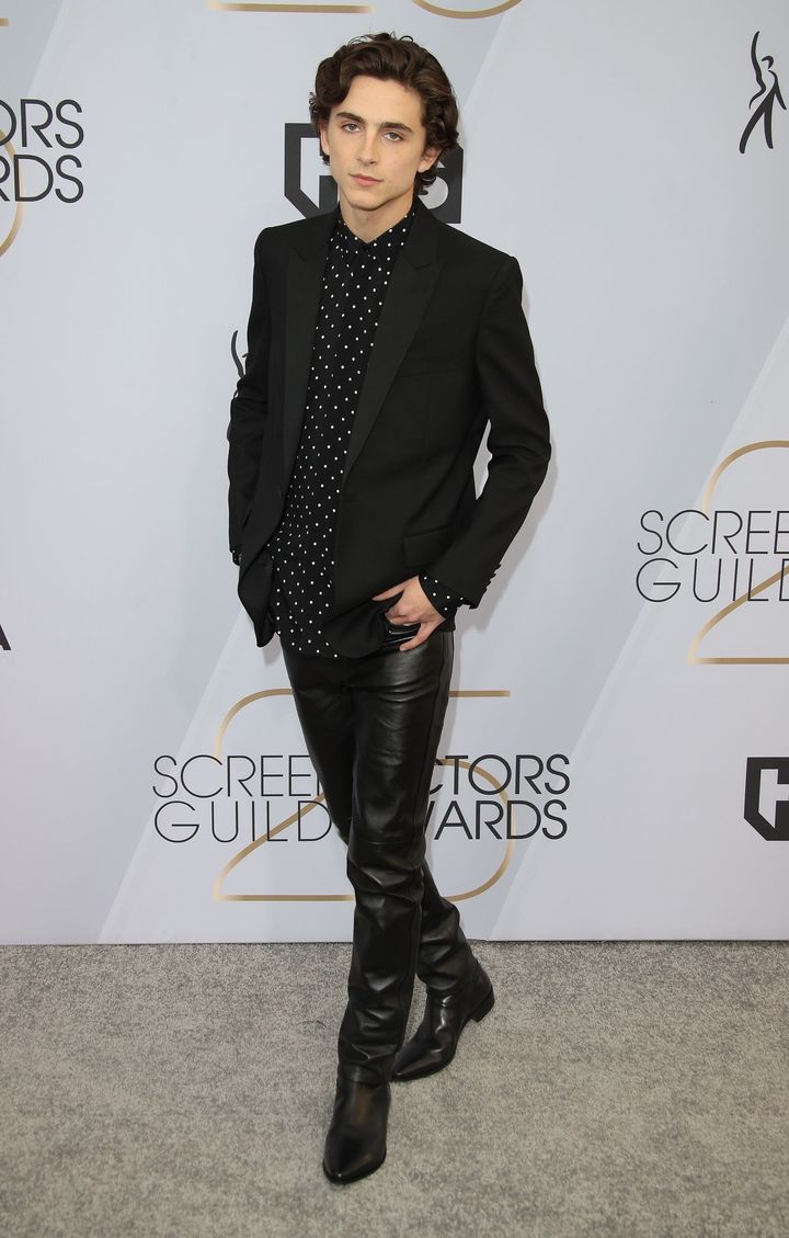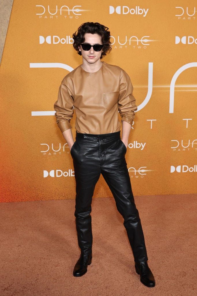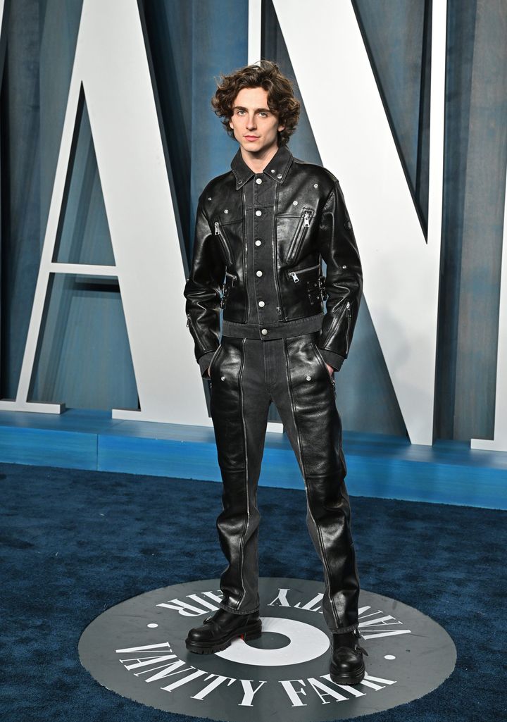 ご機嫌なポーズでカメラに応えるティモシーをLAプレミアにてキャッチ。「トム フォード」のツヤめくレザースーツが、どこか板チョコのよう?
