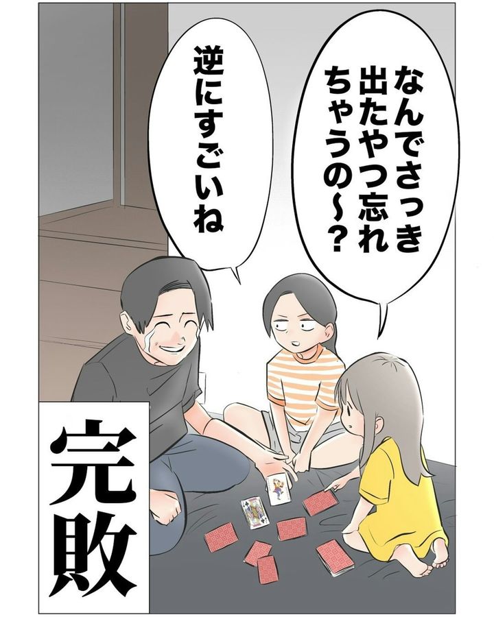 ゆーぱぱ(@yuupapa.ikuji04)さんは、トランプ遊びをする娘との楽しいひとときを漫画で紹介。神経衰弱やババ抜きに本気になる娘と、それに振り回されるパパの姿に、思わず「おつかれさま」と言いたくなります。