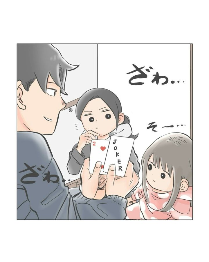 子どもとトランプ遊びでの「あるある」、思わずうなずいてしまいそうです。パパは娘に振り回されながらも、なんだかんだとトランプに付き合っているところが素敵ですよね。