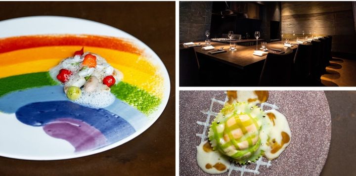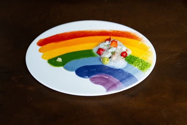 自然の循環に任せることで、本来の力強い味わいや栄養価を高めた野菜を薪火で火入れし、うま味を引き出した一皿だ。そこに風味豊かな七色の野菜ソースを添え、まるでパレットのような彩り鮮やかな料理に仕上げている。