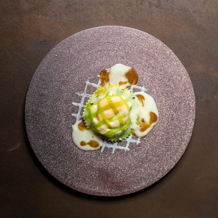 それをそっと包むように親鳥の骨からひいたスープに、ラビオリや庭で捕れたセージとローリエの香りを移したバターソースを合わせ、やさしくまろやかな味わいに仕上げている。メロンパンを思わせるビジュアルも楽しい。