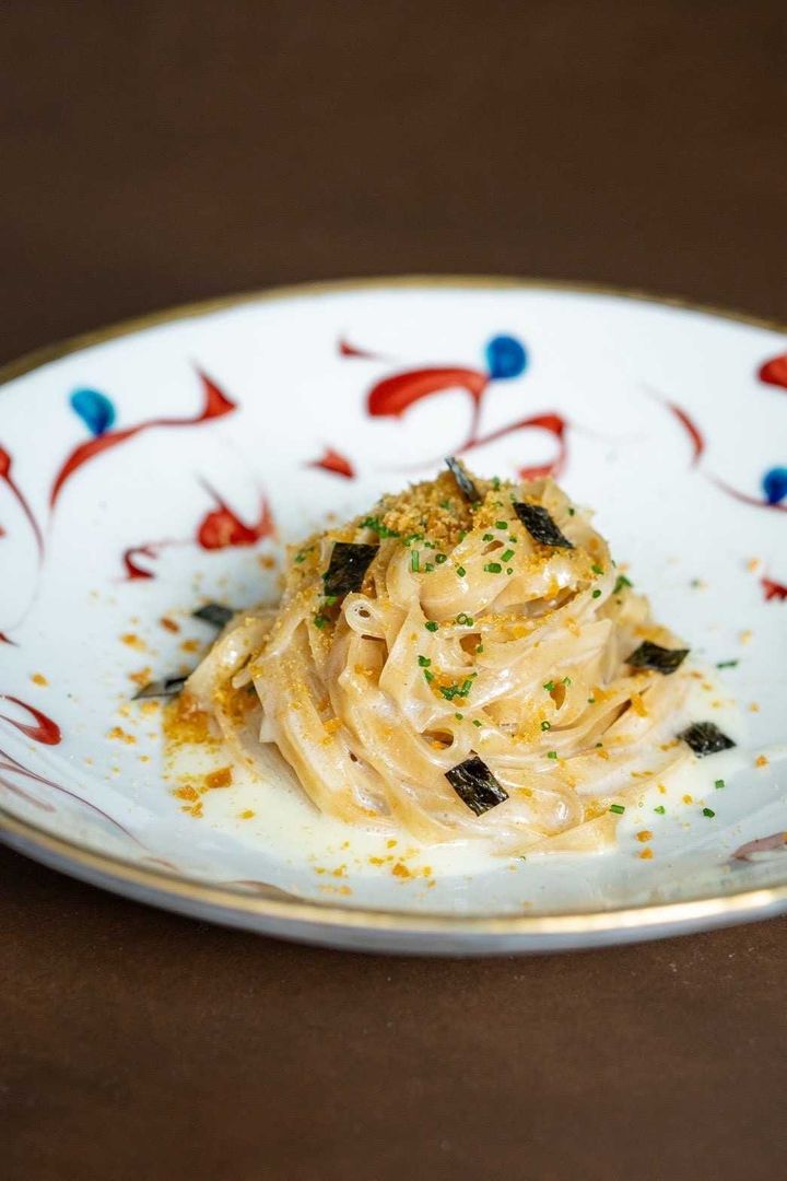 石臼で挽きたての全粒小麦を使用した、歯切れのいい全粒粉パスタに、磯の香りが心地いい海苔やコクのあるカラスミを添えた「自家製粉 全粒粉 手打ちパスタも味わっておきたい一皿。
