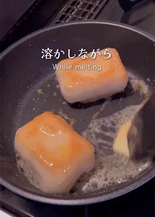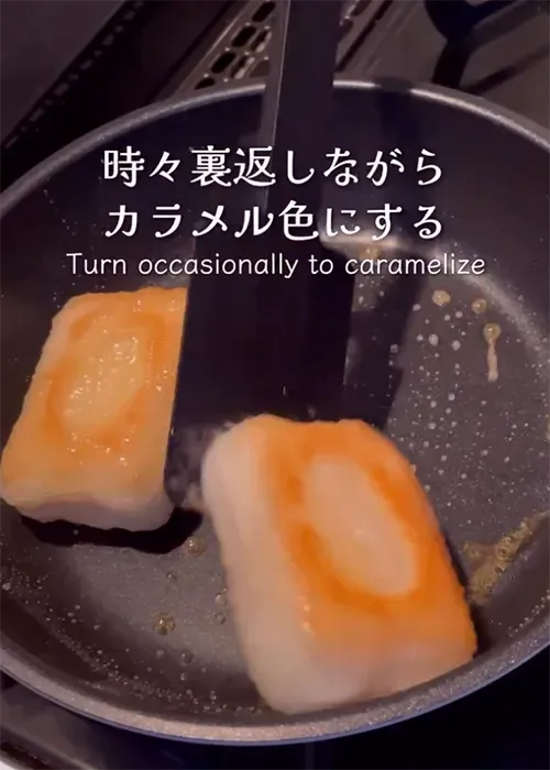 フライパンの蓋を取ったら、餅を時々裏返しながら、両面がカラメル色になるまで煮詰めていきます。