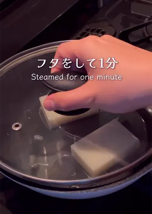 切り餅を入れて全体を砂糖水で濡らし、蓋をして1分蒸し焼きにしましょう。