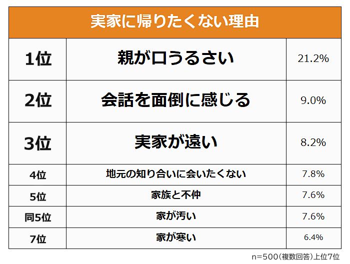 3. 男女500人に聞いた、「実家に帰りたくない理由」ランキング
