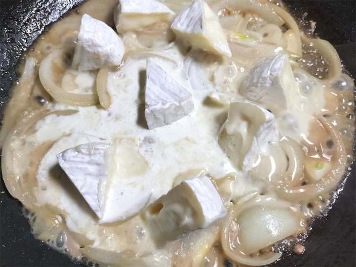 6. 半分くらいに詰まったら生クリームとカマンベールチーズを加え、中火にしてカマンベールチーズを溶かします。