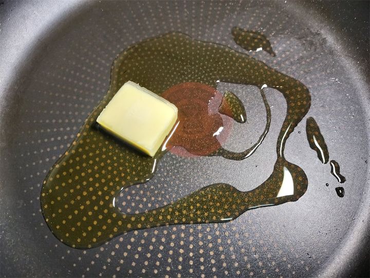 1. フライパンにオリーブオイルとバターを入れて強火にかけます。