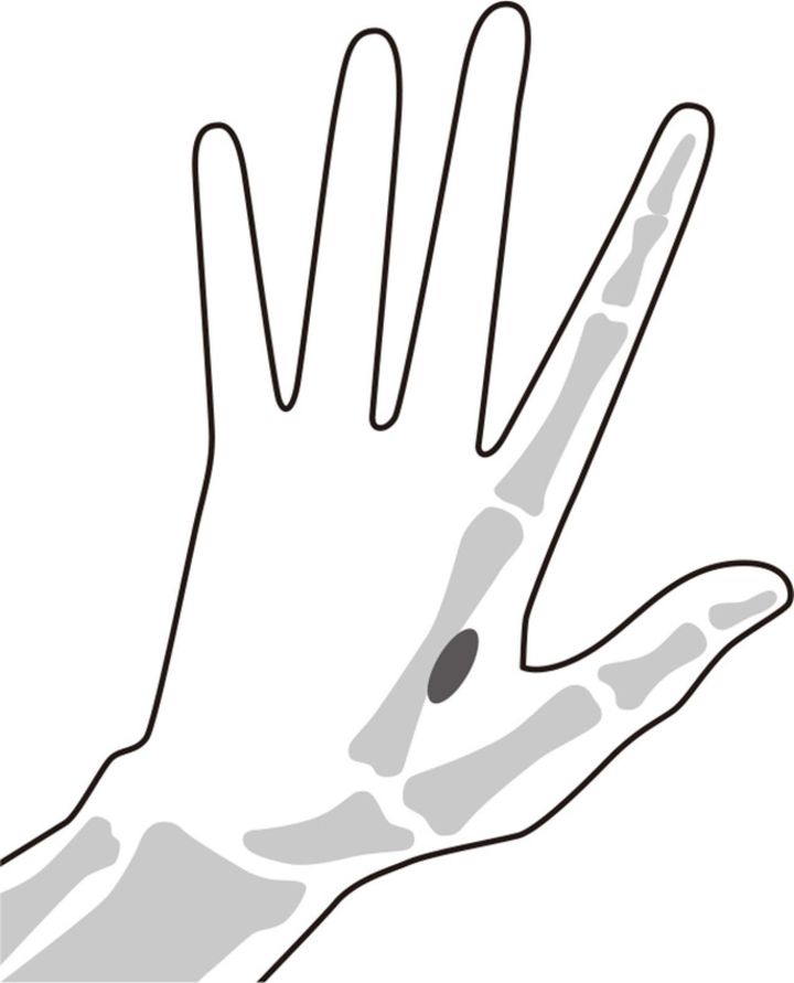 人さし指の付け根の骨のキワにある。「合谷」のツボとは違うので注意。