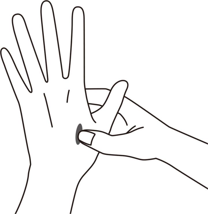 見つけた神経ポイントに親指の爪を当てます。ほかの4本の指は手のひら側に添えて、親指の爪と4本の指ではさみ込みながら10秒間刺激します。