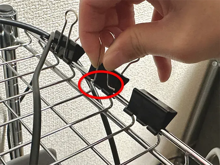 まず、ダブルクリップを棚の端に挟みます。