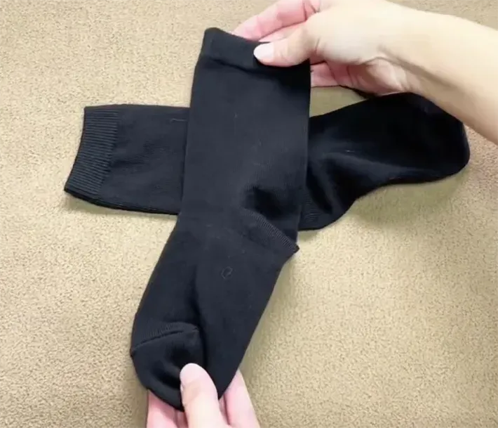 靴下の片方を横向きに置いたら、重ねるようにもう片方を縦に置きます。