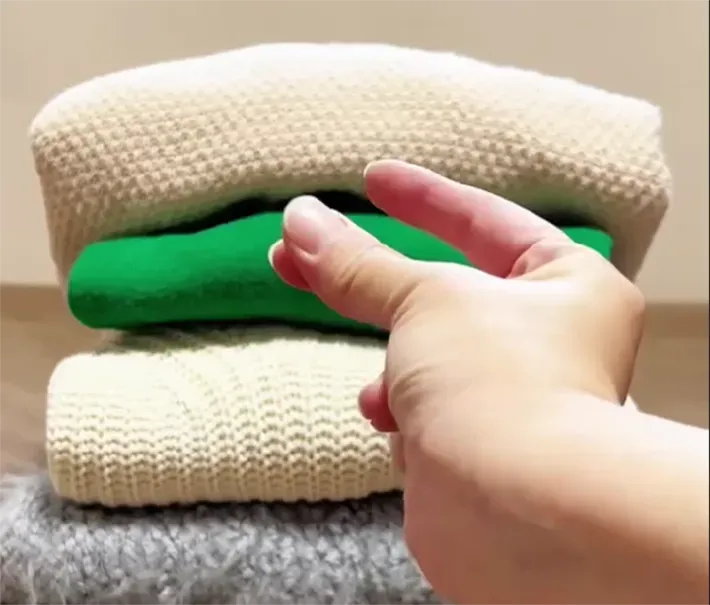 まずは、ニットの畳み方です。重ねるとどうしても崩れがちなニットを、コンパクトかつきれいに収納できる方法を教えてくれました。