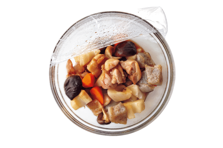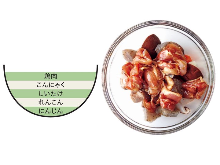 口径20~21cmの耐熱のボールに、にんじん、れんこん、しいたけ、こんにゃくを順に重ねて広げ入れる。鶏肉を汁ごと入れ、ふんわりとラップをする。