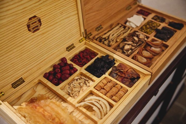 2種類から選べ、ひとつはツバメの巣、魚の浮き袋、高麗人参などを使用した、美容や免疫力アップに効果的なスープ。もうひとつはアワビ、なまこ、鹿の腱、漢方薬材を使った滋養強壮、活力補強が期待できるスープ。