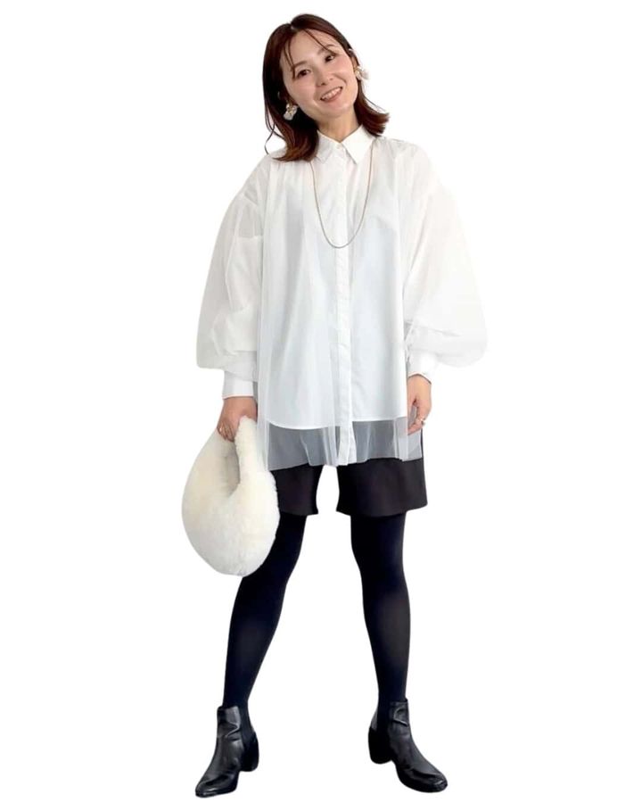 ③大人のモノトーンコーデには盛れる「チュールシャツ」が最適!