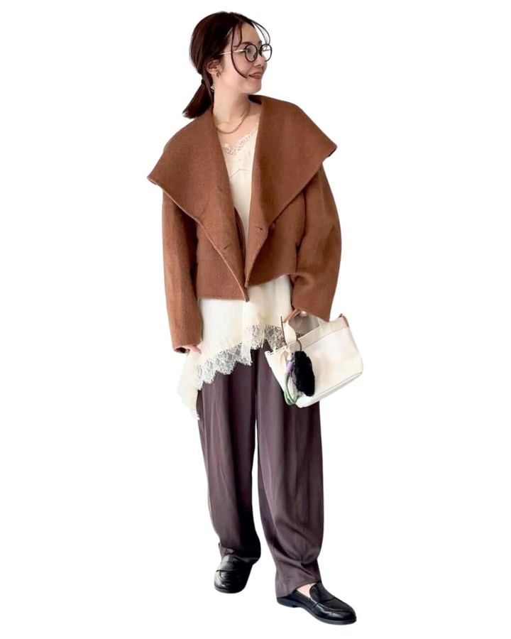 ショート丈なのでトレンドのレースキャミとのバランスも良く、肌見せで抜け感のあるコーデに。パンツもブラウンで統一し、大人のキレイめカジュアルコーデの完成!クリスマスのデートにも可愛い!