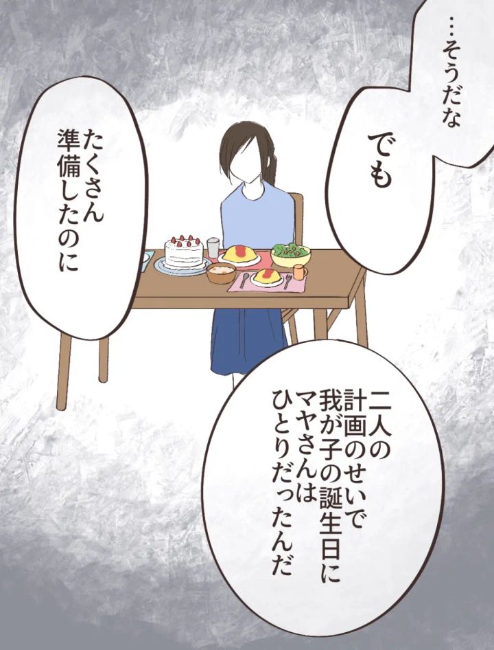 義父は小さく息を吐き、「・・・そうだな、でもたくさん準備したのに、2人の計画のせいで我が子の誕生日にマヤさんはひとりだったんだ」と自分の非を認めようとしない義母を諭すように言いました。