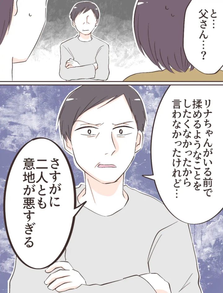 普段は温和な性格の義父が声を荒げたことに驚いたのか、「と、父さん・・・?」と目を丸くするタイキと義母。義父は2人の前に仁王立ちすると、「この前はリナちゃんがいたから黙っていたが、さすがに2人とも意地が悪すぎる」と、きっぱり言い切りました。