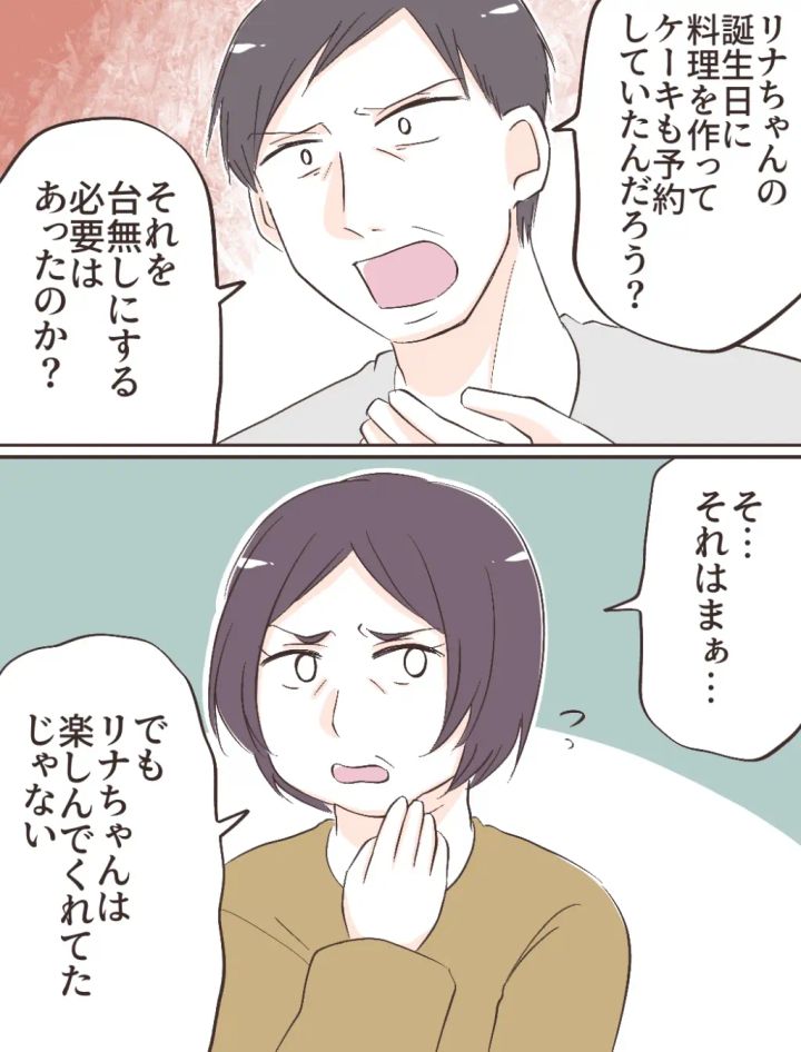 「リナちゃんの誕生日に料理を作って、ケーキも予約していたんだろう?それを台無しにする必要はあったのか?」義父にそう問われると、義母は「それはまぁ・・・」と気まずそうに視線を泳がせました。しかし、自分が責められるのが納得いかないのか「でもリナちゃんは楽しんでくれてたじゃない」と言い返します。
