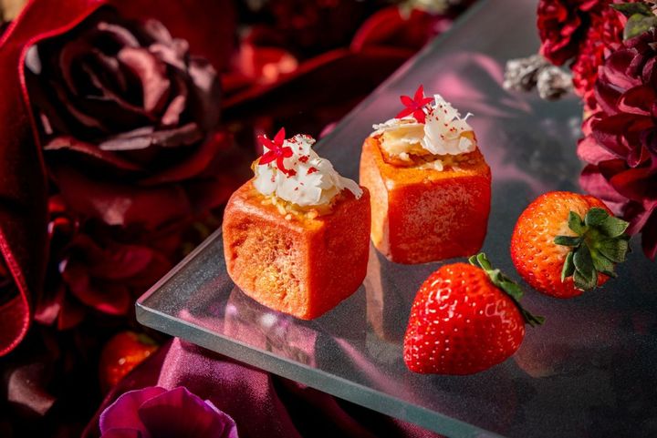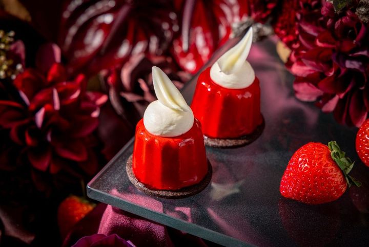 さらに濃厚でとろけるようなチョコレートムースやバラの香りを閉じ込めたゼリーなど、バレンタインシーズンをロマンティックに演出するアイテムを加えた、スイーツ5種とセイボリー3種。赤と白の世界観が織りなす、豊かな味わいを堪能できます。