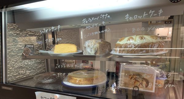 ショーケースにはケーキがいろいろ。 本日のケーキ、キャロットケーキ、ベイクドチーズケーキ、シフォンケーキ・・・。 どれも美味しそう。