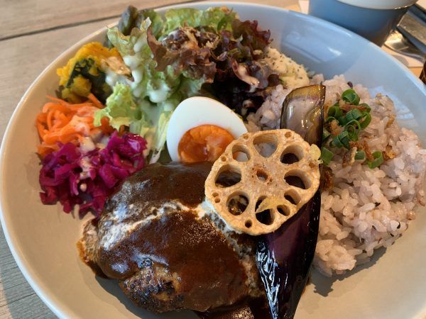 ご飯は、五穀米かな。 添えられた野菜がカラフル! レタス、人参のラペ、紫キャベツのマリネ、ポテトサラダ、カボチャ、茄子とレンコンの素揚げ。 目から美味しい~。 ゆで卵も付いて、ハンバーグもいい感じです♪
