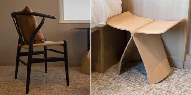 デンマークのハンス・J・ウェグナーがデザインしたカール・ハンセン&サンのCH24(Y チェア)が窓辺に置かれ、日本のインダストリアルデザイナー柳宗理の名作と言われるバタフライスツールがベッドサイドを飾ります。座り心地を確かめたり、窓からの景色をゆったりと眺めたりと、普段のホテルステイとは異なる滞在を楽しめます。