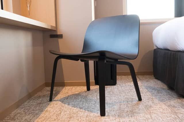 2006年にデンマークで創業したファニチャーブランドMuuto(ムート)の「VISU LOUNGE CHAIR(ビスラウンジチェア)」が置かれます。ベニヤ板をプレスして滑らかな曲面をかたちづくり座面を広くとったシートは座り心地も上々。東京の眺望を楽しむために選ばれたデザイナーズチェアです。