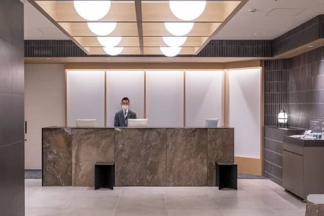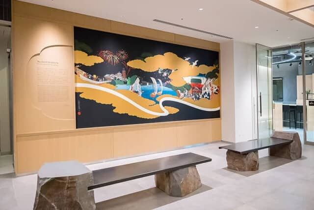 日本独自の感性を描く絵師「OZ-尾頭-山口佳祐」氏の絵が飾られるロビーはインパクトたっぷり。ホテルの立つ場所から見た浅草寺や、かって浅草にあった12階の塔「凌雲閣」が描かれ、江戸時代の人々と現代人が混在するなど昔と今の浅草が融合しています。ベンチの石は神奈川県真鶴町に産出する「小松石」で、江戸城の石垣や浅草寺境内、徳川家代々の墓石にも使われた名石です。座面は黒皮風に仕上げた鋼材のマットで重厚な仕上がりになっています。