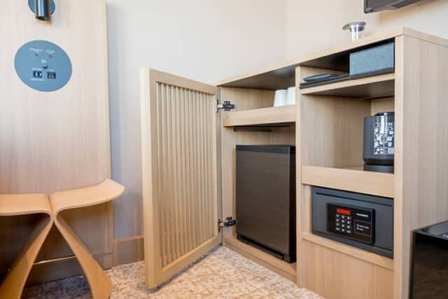 「プレシャスコーナーモデレート」は29平米とゆとりがあって、水回りはトイレが独立しています。ベッドは幅110cm × 長さ203cmが2台、シモンズ社製のベッドマットレスを設置。最大3名まで利用できるので、家族旅行にもおすすめです。