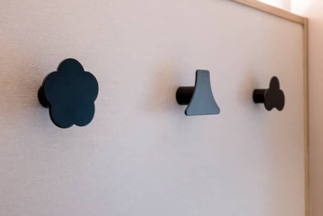 客室に入ってすぐの壁にあるコートやバッグ等のフックも個性的。黒で統一した梅と富士山、松の形をしていました。