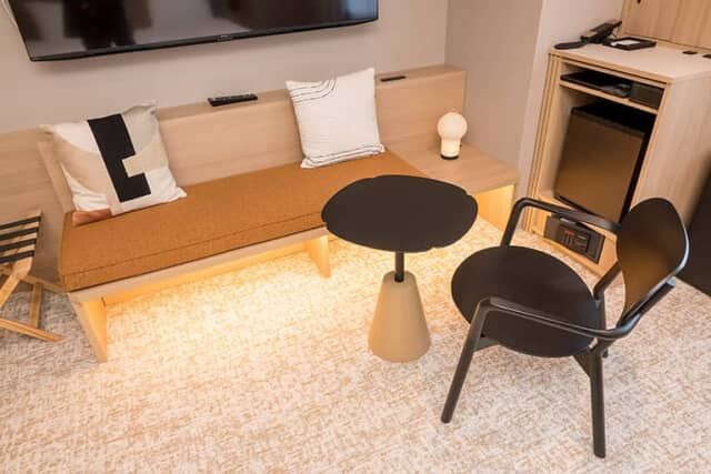 木製のワイドベンチにはオレンジ色のクッションが敷かれた優しい雰囲気。カリモクニュースタンダードの「キャストロールローチェア」は、低い座面とラウンドした背もたれが特徴。花形の天板のあるテーブルも置かれ、どちらも黒で統一しています。ワイドベンチの下は収納スペースになっているので、スーツケースや靴などを入れられます。