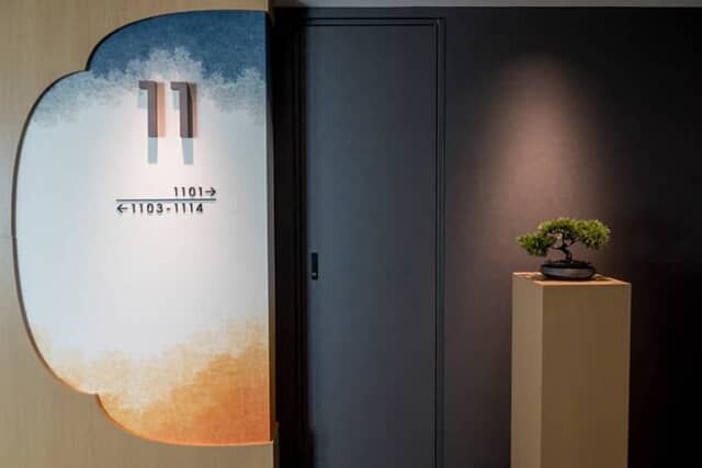 エレベーターホールには盆栽が飾られます。フロア数字やルームナンバーには小松石を使い、1階ロビーからのつながりを表現。数字の上下を青とオレンジで滲ませているのは、“一文字(いちもんじ)ぼかし” という浮世絵の技法で、空の色を塗りつぶさずに白を残し、版木の上部だけ晴天の青や曇天のオレンジに、横一文字にぼかす手法です。床には石畳を思わせるカーペットが敷かれ、お寺の参道をイメージしています。