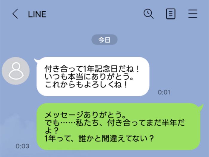 私:「メッセージありがとう。でも……私たち、付き合ってまだ半年だよ? 1年って、誰かと間違えてない?」