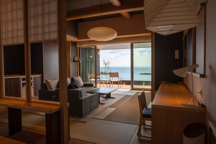 香川県・小豆島の小さな集落に佇む海音真里。車で5分程の場所にある「島宿真里」の別邸として誕生した宿で、穏やかな瀬戸内海が眼前に広がる抜群のロケーションが魅力です。全6室の客室は、和とモダンが融合した安らぎの空間。すべてオーシャンビューかつ展望風呂付きで、部屋のいたるところから瀬戸内海の絶景を堪能できる作りになっています。ただぼんやりと海を眺め、波音に包まれる。そんな「何もしない贅沢」が叶う場所です。