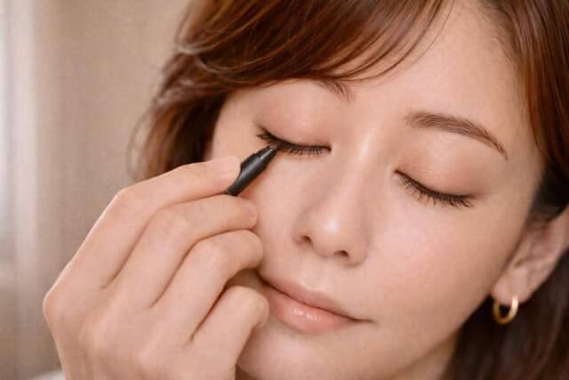 まつげの間に極細ライナーを少しずつ置くだけで、自然な立体感が出て、にじんでも影が広がりにくくなります。さらに、シャドウの締め色を細く重ねれば、ラインの存在感がやわらぎ、メリハリだけが残ります。