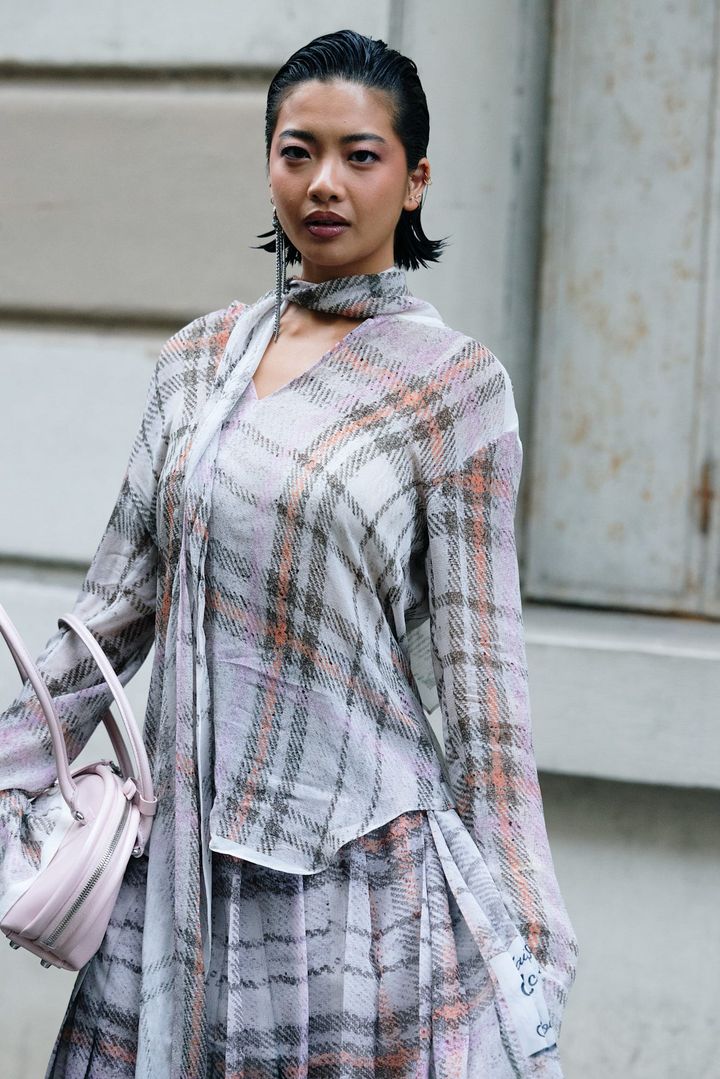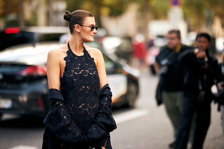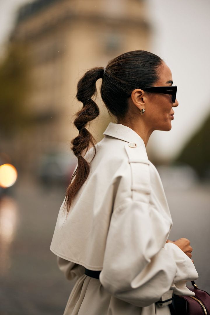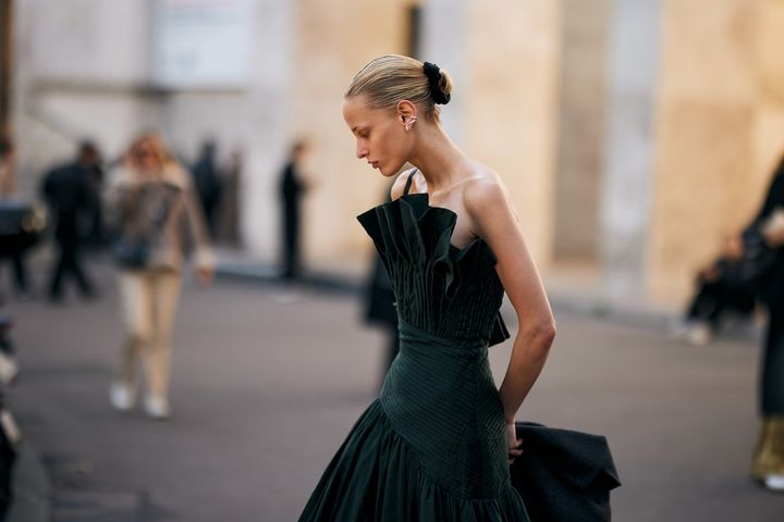 エディター:スナップを見ていると、コンパクトなシニヨン×シュシュの組み合わせは、カジュアルさが出て今っぽいなと思います。でも一歩間違えると子どもっぽくなったり、古くさく見えたりしそうですが、シュシュの選び方のコツは?
