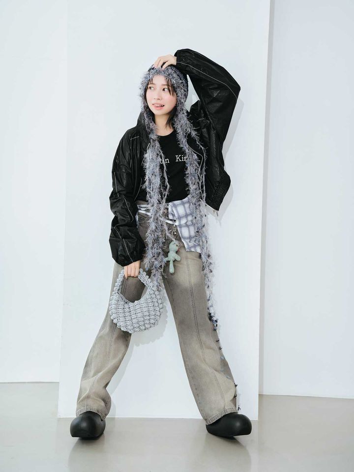 ミニSKのタイトなシルエットにオーバーサイズのアウターを合わせる韓国の鉄板スタイル。ジャケットは肩まわりの落ち感や袖のボリューム感にひねりを加えたデザインで、K-POP風のY2Kビジュを今っぽく刷新。